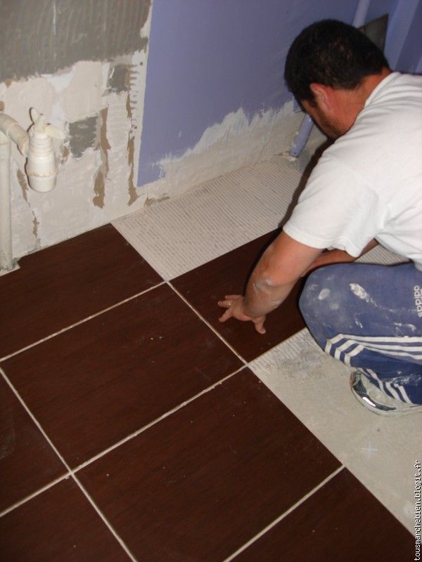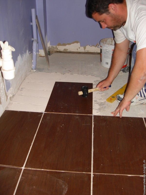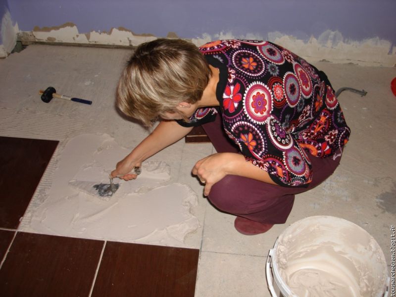 la rénovation de la salle de bain "4° étape pose du carellage du sol"