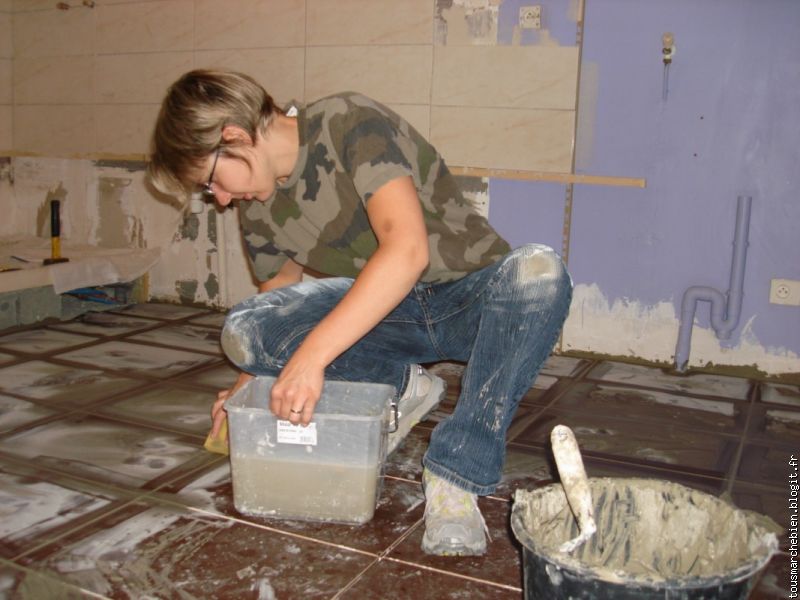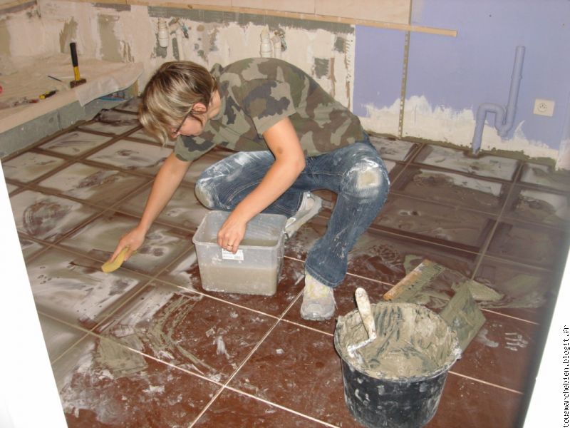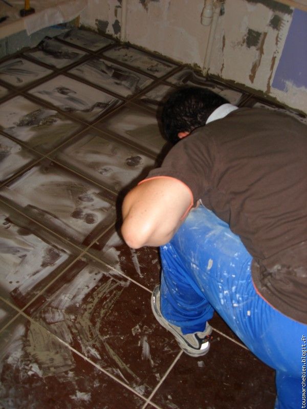 la rénovation de la salle de bain "5° étape le jointement du carellage du sol"